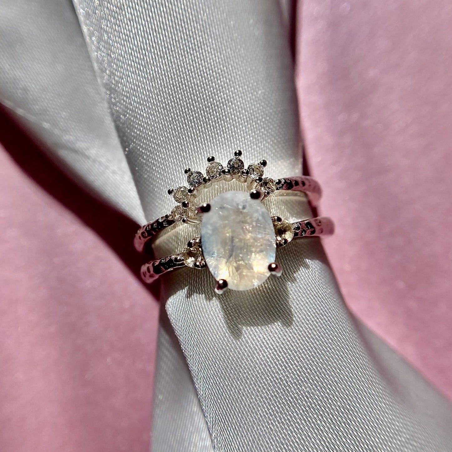 Embrace elegance and symbolism with our Moonstone and White Topaz ring set. Featuring an oval moonstone ring and a curved white topaz stacking ring, both crafted in 925 sterling silver with rhodium plating and unique hammered bands.